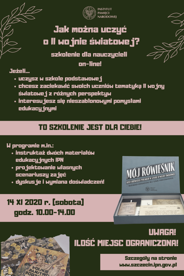 Niezbędnym wymogiem uczestnictwa jest sprawny internet oraz możliwość uruchomienia kamerki w komputerze. Szkolenie nie będzie nagrywane. Wszyscy uczestnicy otrzymają dostęp on-line do wielu materiałów, a także produkty „materialne” (przede wszystkim premierowy „Mój rówieśnik. Losy obywateli polskich w czasie II wojny światowej”).