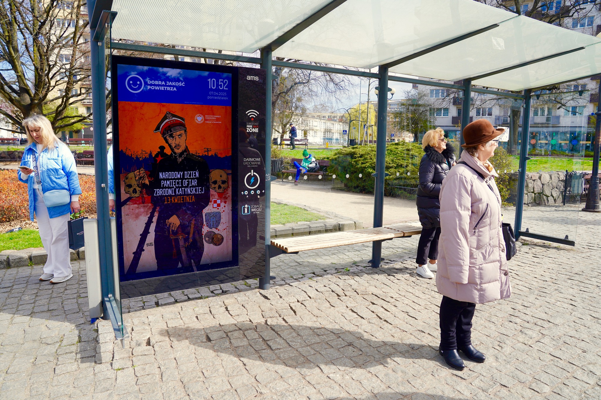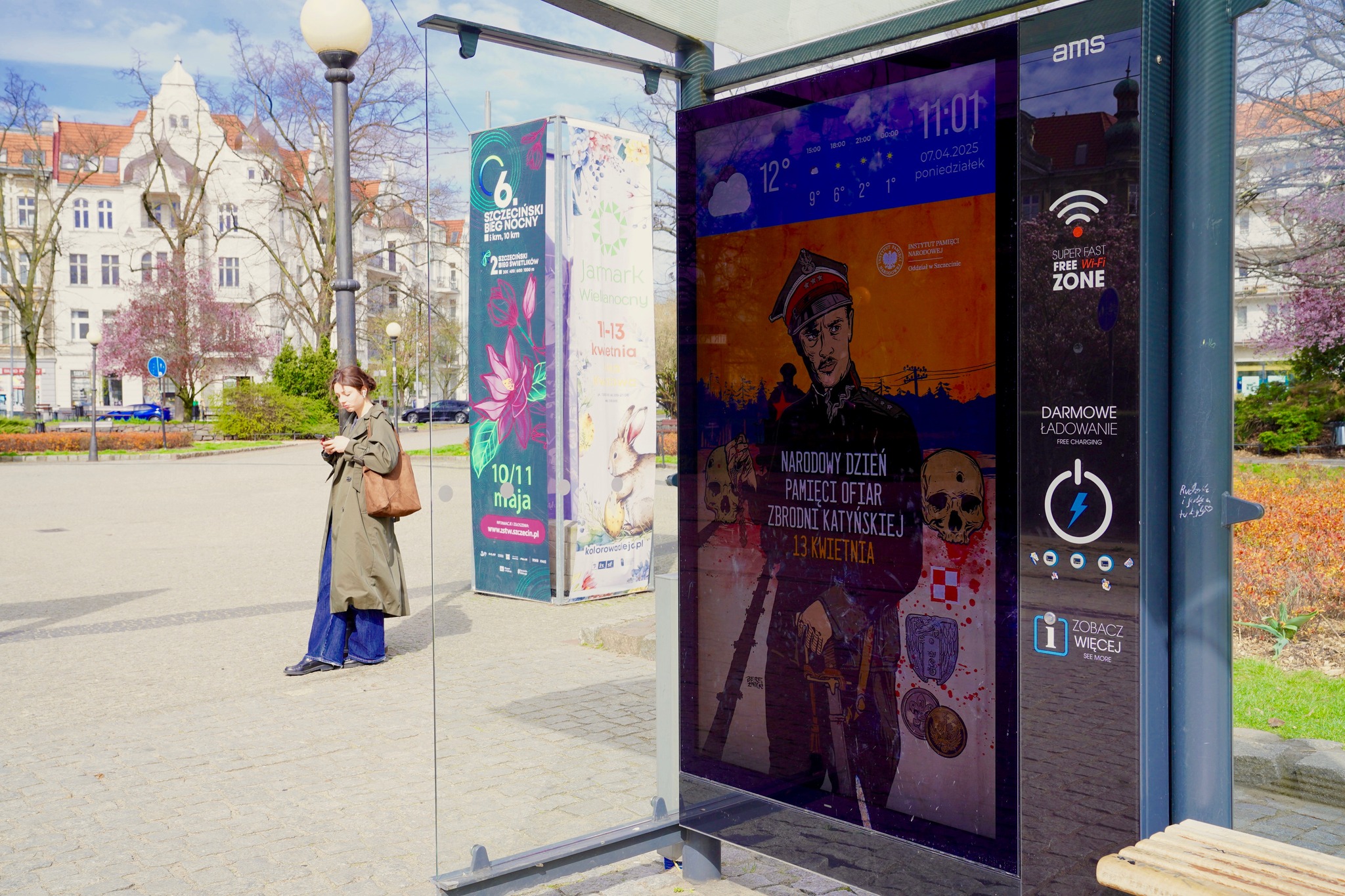 Jednocześnie od 7 kwietnia na nośnikach elektronicznych, tzw. citylight, umieszczonych na kilku wiatach przystankowych w ścisłym centrum Szczecina, rozpoczęliśmy kampanię informacyjną przed przypadającą 13 kwietnia 85. rocznicą Zbrodni Katyńskiej. Elektroniczne plakaty mają przypominać Szczecinianom o pomordowanych w Katyniu Polakach. Także w Koszalinie wydrukowane plakaty pojawiły się na autobusowych wiatach przystankowych. Ta outdoorowa kampania potrwa do 13 kwietnia. Obchody Dnia Pamięci Ofiar Zbrodni Katyńskiej w 85. rocznicy Zbrodni Katyńskiej odbędą się w Szczecinie już w najbliższy piątek, 11 kwietnia, na Cmentarzu Centralnym.