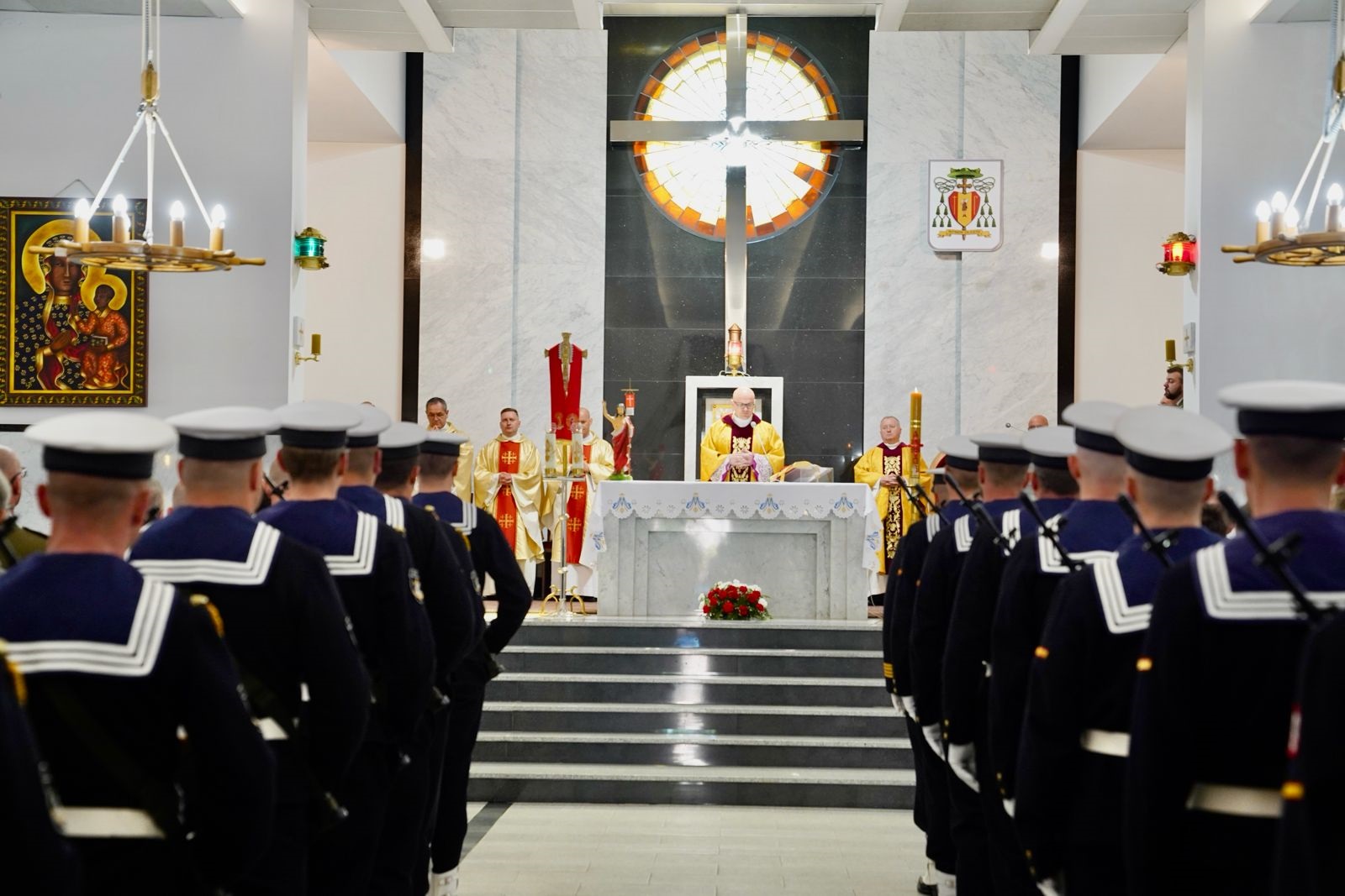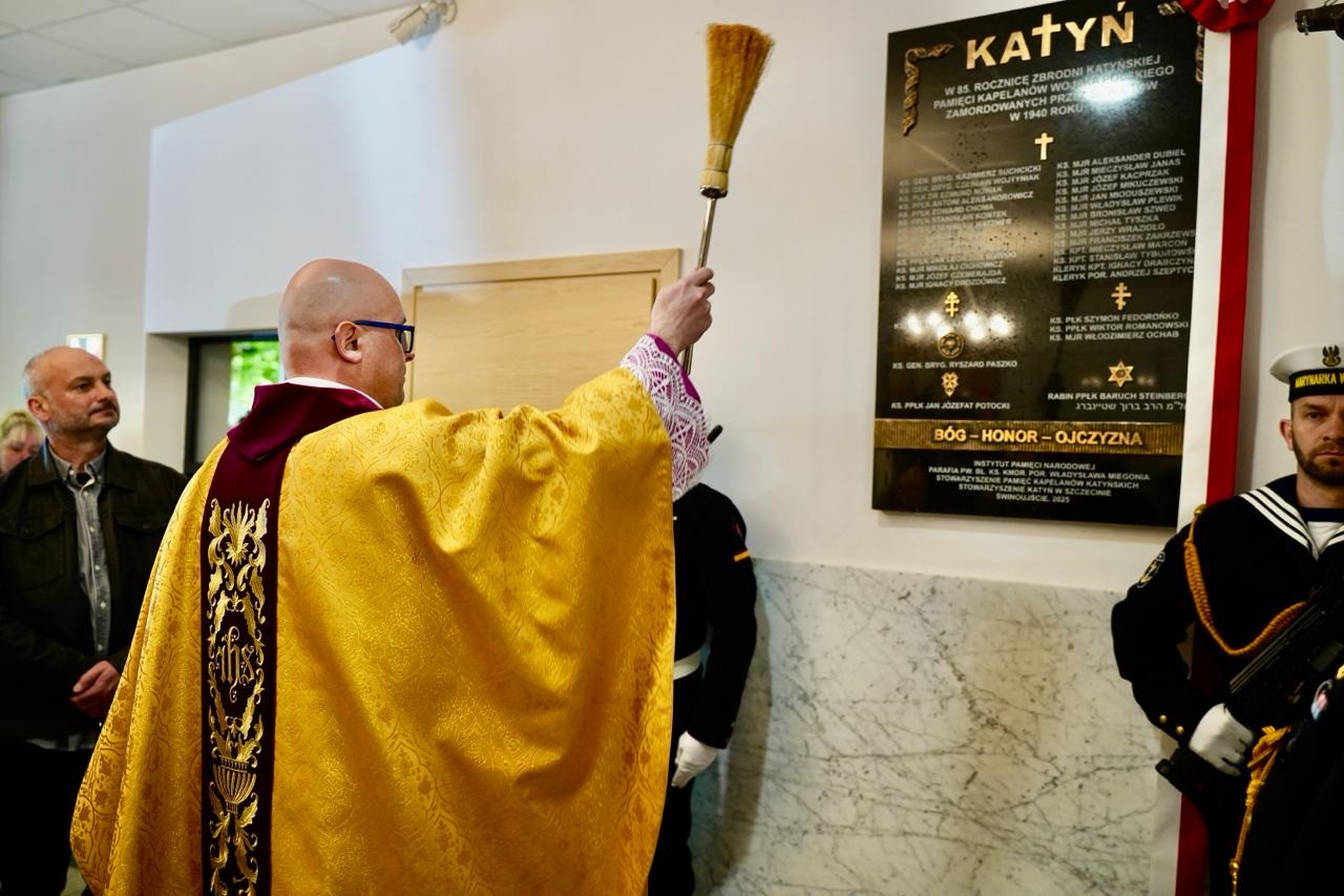 Uroczystość odsłonięcia i poświęcenia tablicy odbyła się dziś w kościele garnizonowym w Świnoujściu. Na tablicy figurują nazwiska wszystkich dotychczas ustalonych z imienia i nazwiska kapelanów, którzy zostali zamordowani w zbrodni katyńskiej. Została wykonana z czarnego granitu, odlany z brązu i umieszczony w górnej części napis informuje o zbrodni katyńskiej. Wężyki oficerskie w górnych rogach tablicy nawiązują do stopni wojskowych pomordowanych kapelanów. Na tablicy znajdują się nazwiska 35 zamordowanych kapelanów. Nad nimi widnieją symbole wyznań.