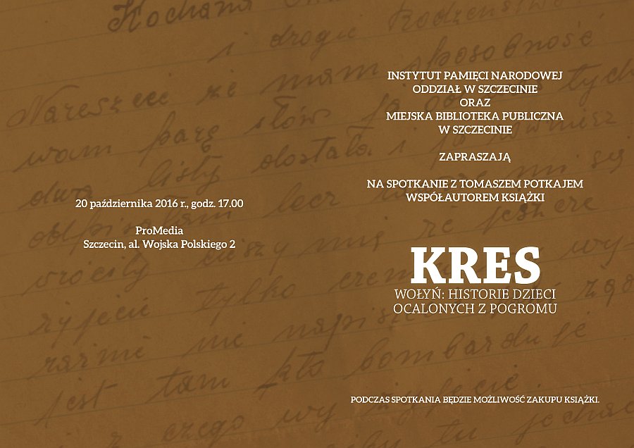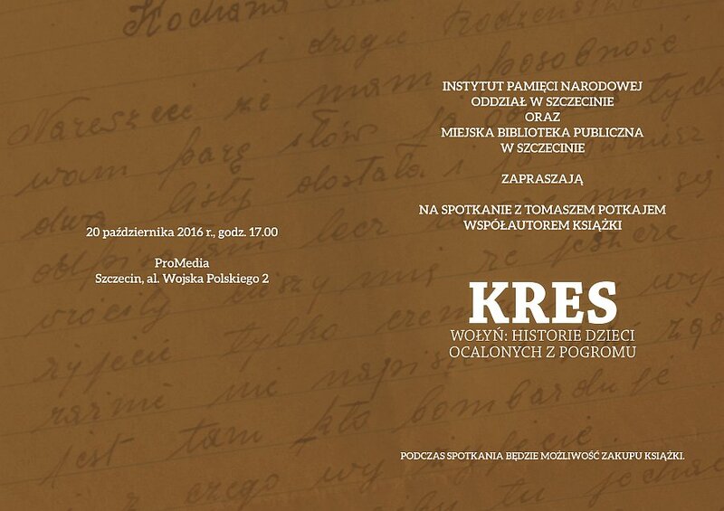 Instytut Pamięci Narodowej Oddział w Szczecinie oraz Miejska Biblioteka Publiczna w Szczecinie zapraszają w czwartek o 17.00 na spotkanie z Tomaszem Potkajem współautorem książki „Kres. Wołyń, historie dzieci ocalonych z pogromu”.