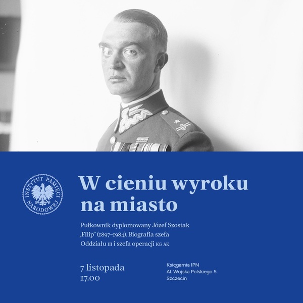 03/11/2023Zapraszamy do Księgarni IPN w Szczecinie na spotkanie pt. „W cieniu wyroku na miasto. Pułkownik dyplomowany Józef Szostak Filip (1897-1984). Biografia szefa Oddziału III i szefa operacji KG AK” – Szczecin, 7 listopada 2023, godz. 17.00