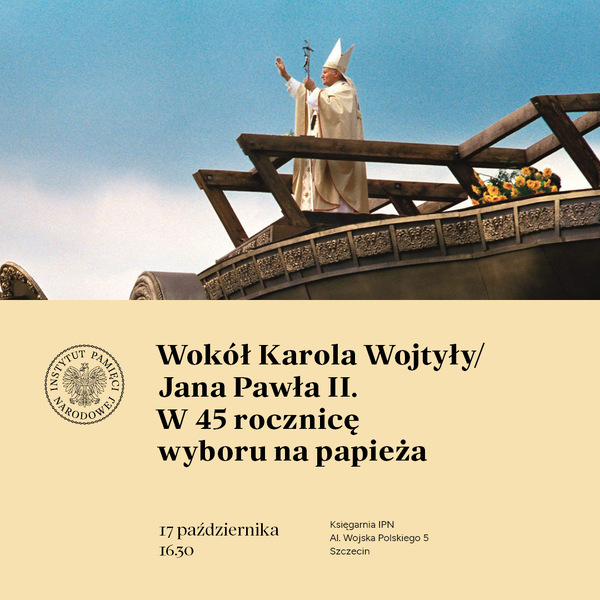 16/10/2023Zapraszamy do Księgarni IPN w Szczecinie na spotkanie pt. "Wokół Karola Wojtyły/Jana Pawła II. W 45. rocznicę wyboru na papieża". – Szczecin, 17 października 2023, godz. 16.30