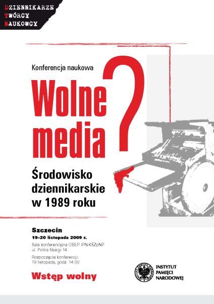 W ramach projektu badawczego „Aparat bezpieczeństwa wobec środowisk twórczych, dziennikarskich i naukowych” Biura Edukacji Publicznej IPN-KŚZpNP w dniach 19–20 listopada 2009 r. w siedzibie Oddziałowego Biura Edukacji Publicznej IPN-KŚZpNP w Szczecinie, przy ul. Piotra Skargi 14, odbędzie się konferencja naukowa pt. „Wolne media? Środowisko dziennikarskie w 1989 roku”. Do udziału zaprosiliśmy grono badaczy od lat zajmujących się badaniem archiwów byłej Służby Bezpieczeństwa oraz spuścizny po Polskiej Zjednoczonej Partii Robotniczej, którzy opowiedzą o wynikach swoich kwerend. Poruszona tematyka od lat budzi zainteresowanie ze względu na charakter zmian przeprowadzanych w tym ważnym, z punktu widzenia dziejów Polski, okresie. Konferencja ma za zadanie przybliżenie tego, co działo się w środowisko dziennikarskim, oraz przedstawienie postaw konkretnych postaci.